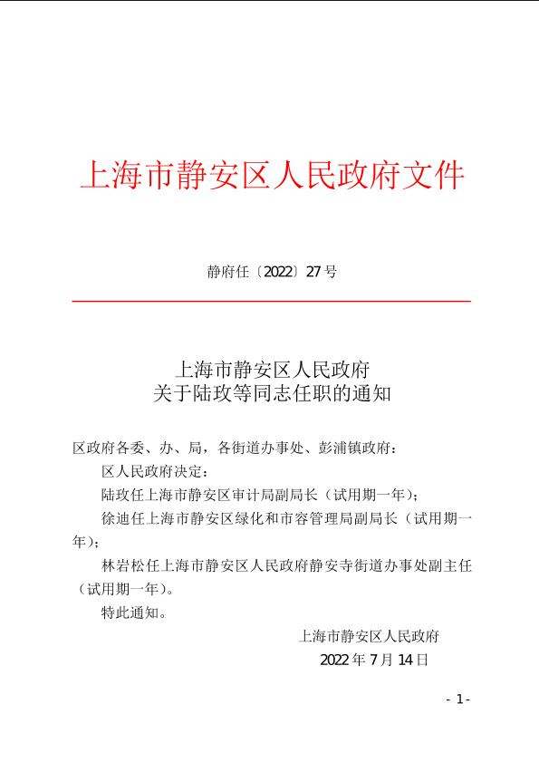 林岩松任上海市静安区人民政府静安寺街道办事处副主任(试用期一年)。