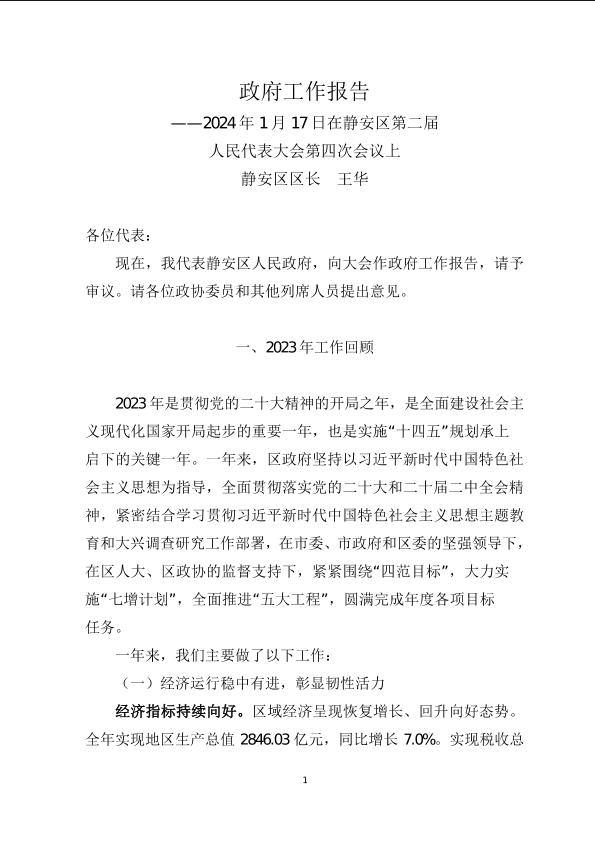 现在,我代表静安区人民政府,向大会作政府工作报告,请予审议。请各位政协委员和其他列席人员提出意见。