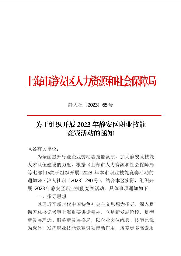 索取号:JB2300000-2023-048发布机构:区人力资源社会保障局标题:关于组织开展2023年静安区职业技能竞赛活动的通知文号:静人社〔2023〕65号主题分类:劳动、人事、监察/劳动就业