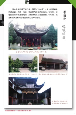 第二部分 钱业会馆始建于清光绪十四年(1888 年)。原址在河南北 路塘沽路,占地十六亩,有前后两殿和两座戏台。1974 年,会 馆的文财神殿迁往青浦,文财神殿戏台迁至豫园。1976 年,武 圣殿及武圣殿戏台迁至嘉定汇龙潭公园内。 孤帆远影 在嘉定的沪北钱业会馆武圣殿戏台(1991 年) 在青浦的沪北钱业会馆武圣殿(1994 年) 在青浦的沪北钱业会馆文财神殿(1994 年) 在豫园的沪北钱业会馆 文财神殿戏台(1998 年) 光影漫旅画静安——纪念改革开放 40 周年 30