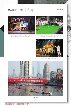 第三部分 浪遏飞舟 精彩瞬间 2017 国际剑联花剑世界杯大奖赛 “斯诺克”国际大师走进回民中学 2005 年上海国际茶文化节 百舸争流 光影漫旅画静安——纪念改革开放 40 周年 42