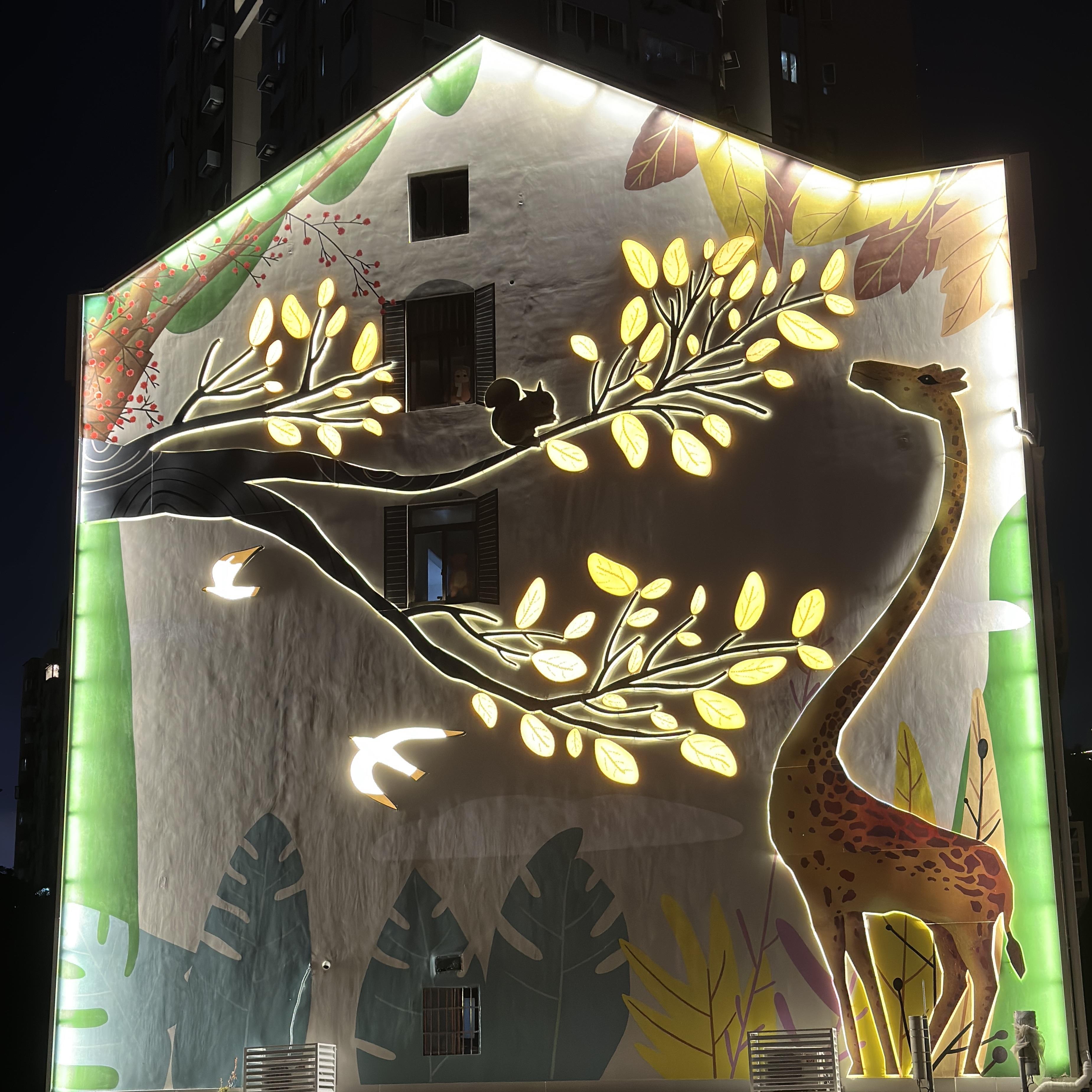 在工程建设中,还配置安装了景观灯光、喷涂了真石漆,从而不仅提升了墙体的景观,并且在夜间点亮了周边的道路,让过往行人能够感受到温暖与安全。