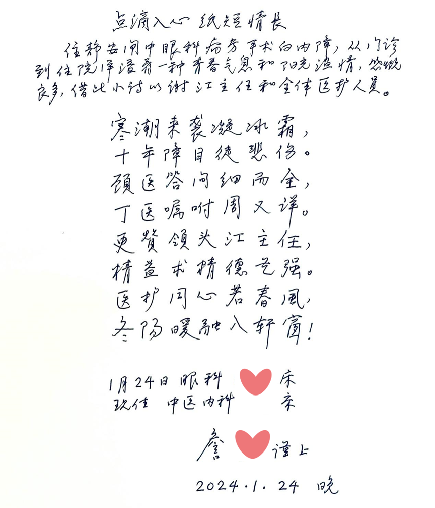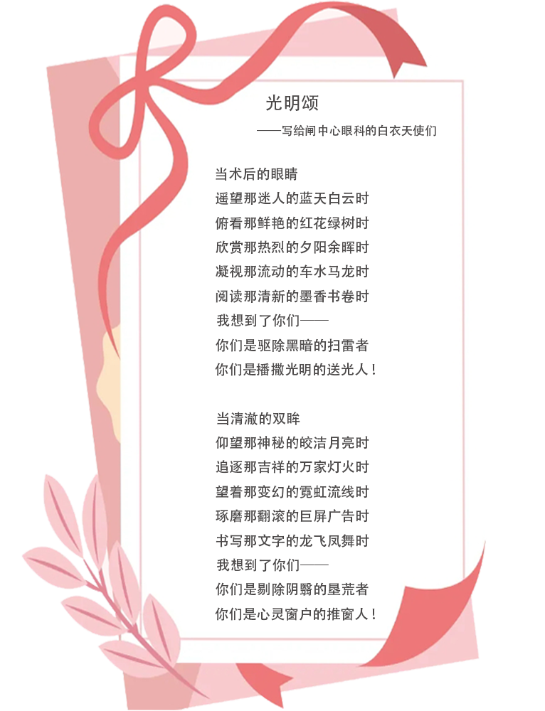 目前,詹老伯的左眼视力提升至1.0,两眼视力近乎平衡带来的舒适度,令其生活便利度大大提高。“感谢你们这个优秀的团队让我重见光明!” 詹老伯激动地表达着感谢之情,并再次写下一首《光明颂》赠与静安区闸北中心医院眼科的白衣天使们。