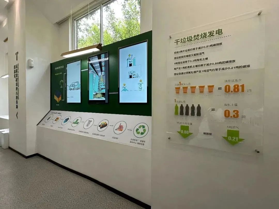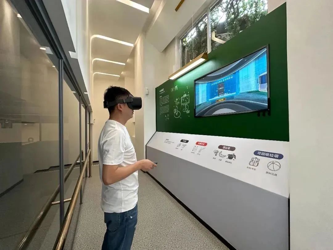 同时,利用中转站一层及二层作业区围廊空间所设立的小型垃圾分类科普展馆,也通过多媒体交互装置和VR设备互动体验垃圾分类,让参观者在体验中了解流转中心全过程作业模式,从不同角度引导市民学习理解垃圾分类科普知识。
