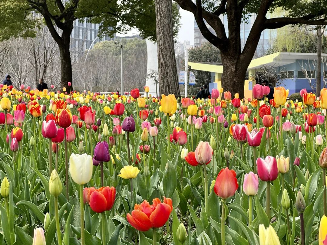 的确,眼下的大宁公园正是满园多色交织、山花烂漫时,百余株玉兰花及五十万株郁金香竞相绽放,酿浓情春意。