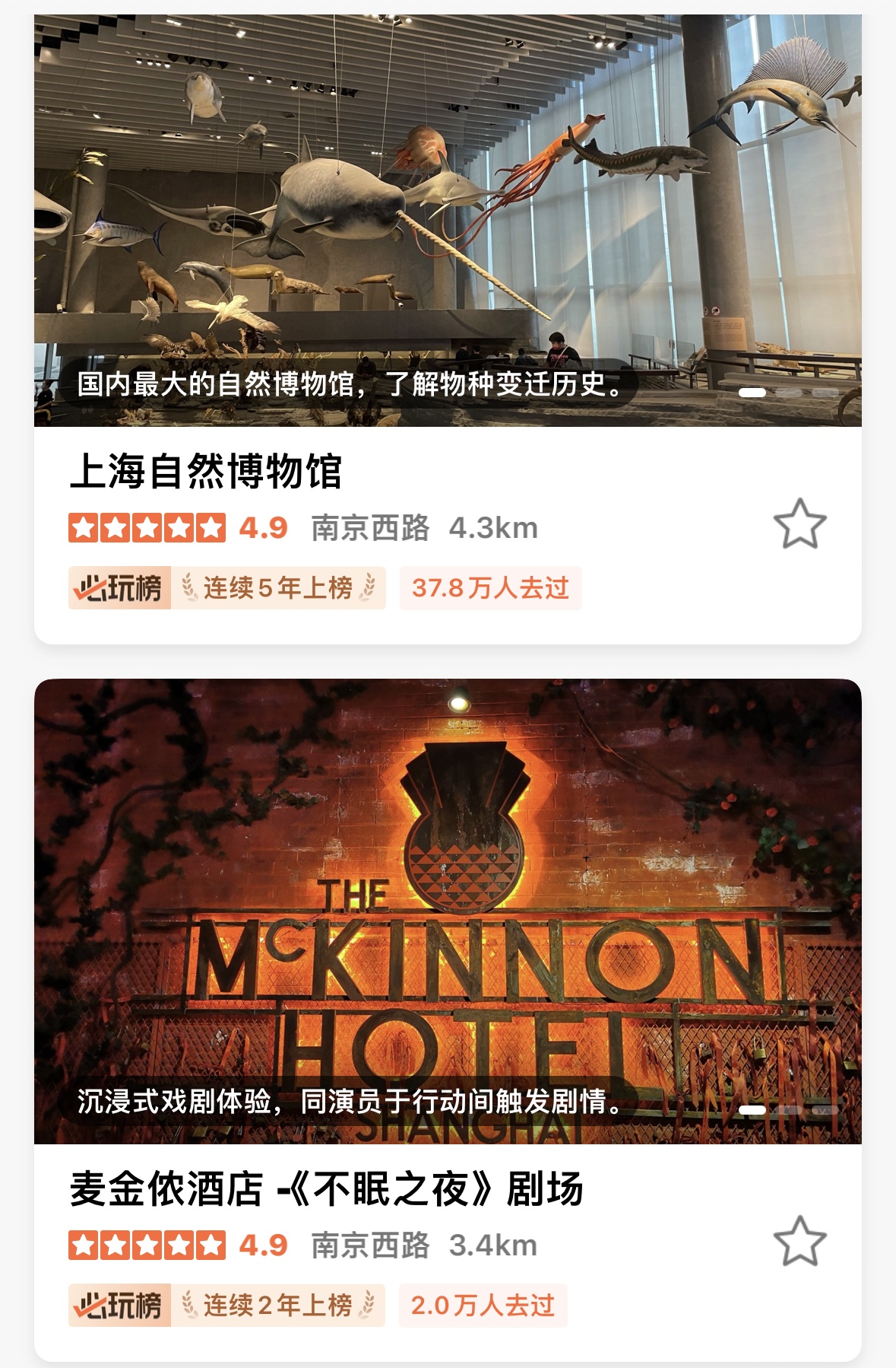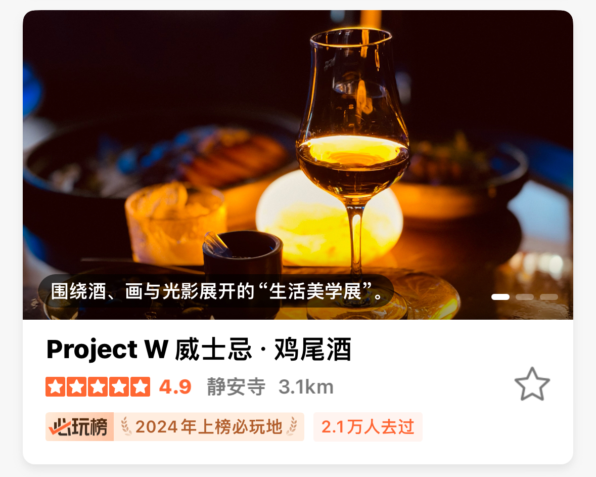 静安上榜游玩地为5个,排名全市第三,分别是上海自然博物馆、静安寺、上海四行仓库抗战纪念馆、麦金侬酒店-《不眠之夜》剧场和Project W威士忌·鸡尾酒,涵盖亲子玩乐、历史古迹、展览展馆、夜生活等多样化出游场景,满足各类人群的出游需求。![]()