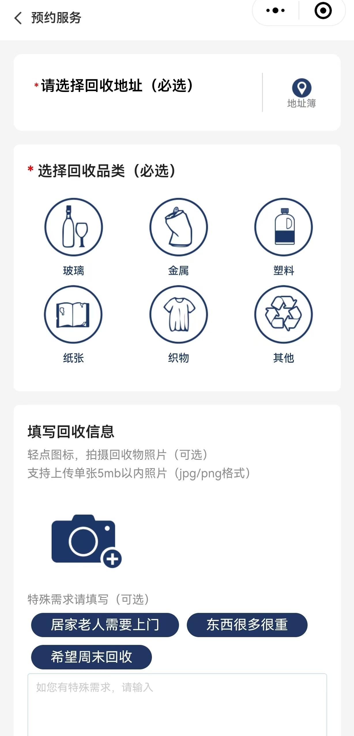 2、主页面上分为“我要预约”和“我要交投”两种模式。点击“我要预约”后,选择地址和回收品类,填写回收信息,即可“一键预约”流动型回收服务,还能备注“居家老人需要上门”“东西很多很重”“希望周末回收”等需求;预约完成后,回收企业将与居民电话联系约定时间前往回收。