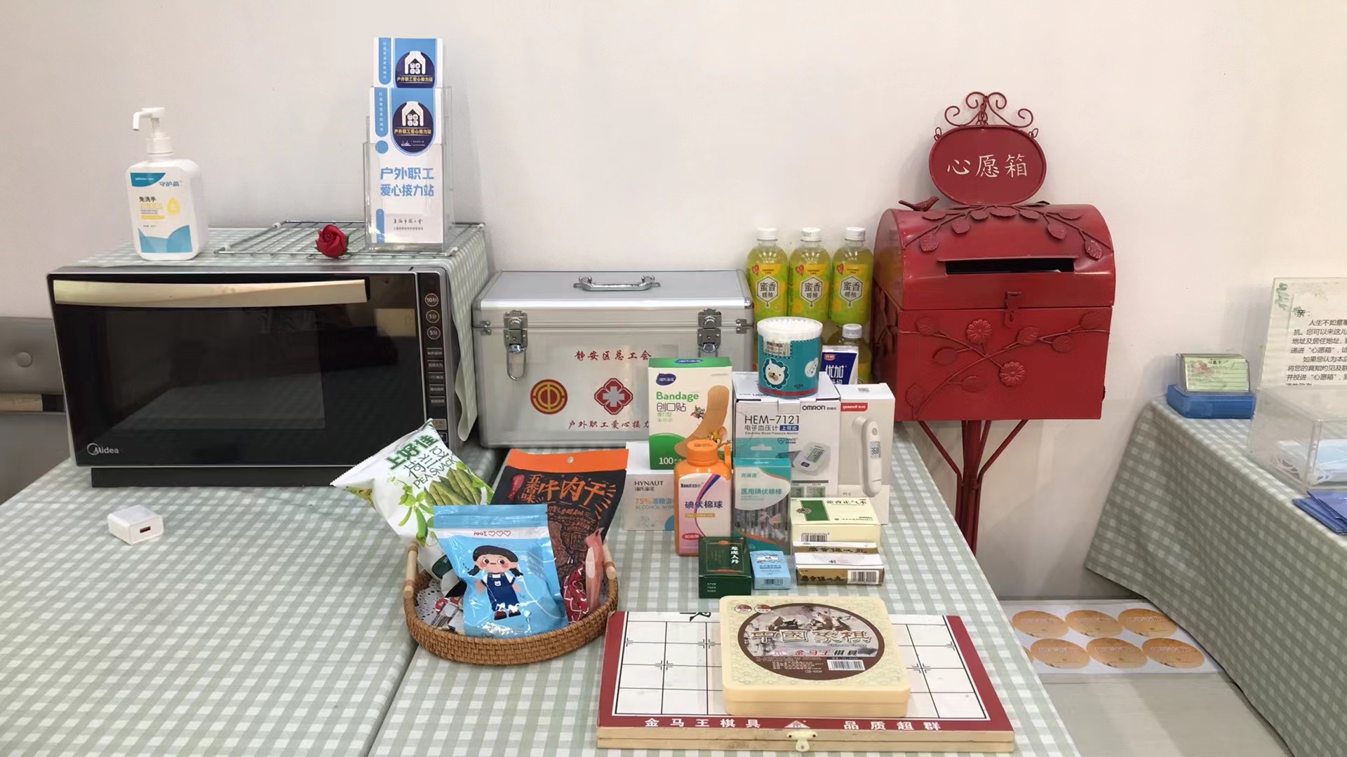 高温连连,酷热难耐。刚刚送完单的外卖小哥走进位于天目中路307号1楼的户外职工爱心接力站休息,吹吹空调、给手机充会电。这里也是北站街道慈善超市所在地,店内的桌子上整齐地摆着饮料、矿泉水、大麦茶等,这些专门为在烈日酷暑下工作的户外劳动者而准备。