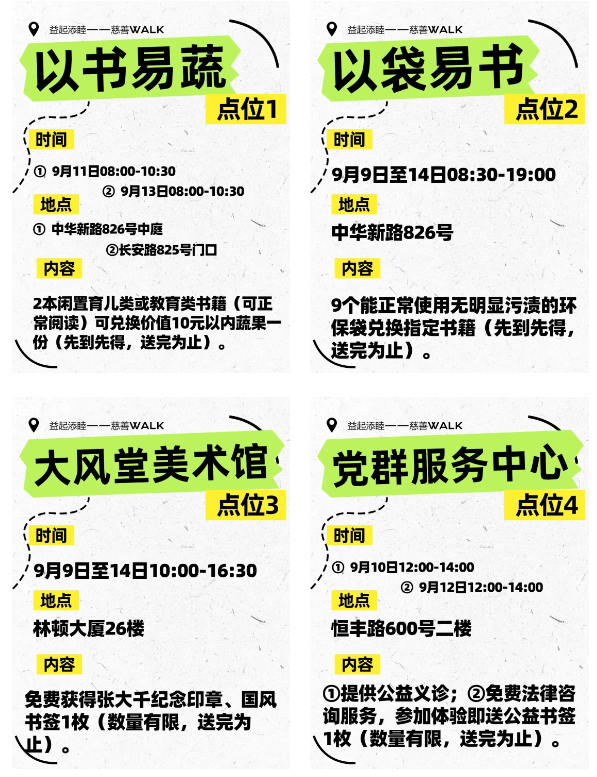 据悉,这些点位的活动丰富多彩、创意十足,从“以书易蔬”到“以袋易书”,从公益烘焙课到公益讲座、公益集市,每一位参与者都能在行走中感受到公益的乐趣,共同探索社区治理的新路径。