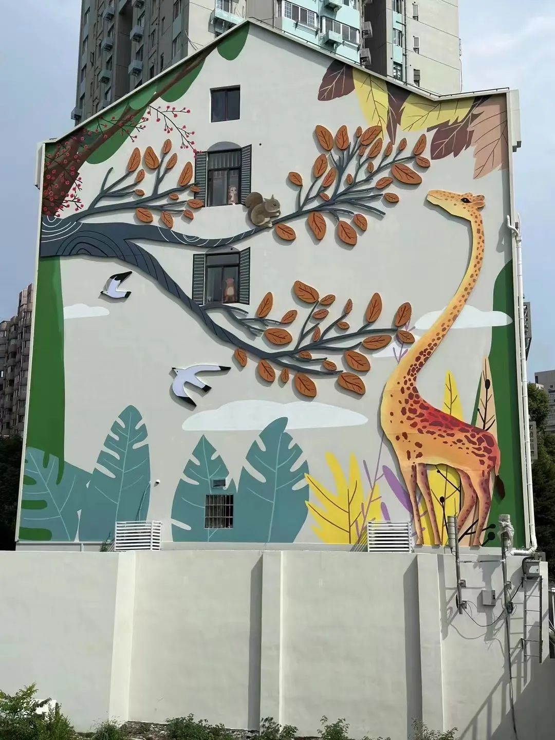 光复路909号建筑的山墙改造就是其中的一个亮点。这面墙位于昌平路桥与光复路的路口,改造前破损严重,与周边全新的城市绿道形成了鲜明对比。