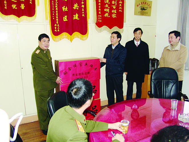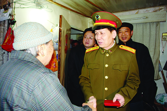 2月1日,上海警备区副政委张龙少将,静安区委常委、区人武部部长骆克江、副区长徐孙庆等,走访慰问了区部分困难家庭,送上新春佳节的问候。早晨8点多,他们来到74岁的袁有娣家。袁老的小儿子因公牺牲,老伴也已去世,张龙少将亲切询问袁老的身体状况,并送上了新春慰问品。记者 裘梅芳