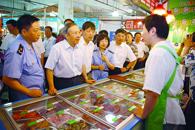 7月21日,市人大常委会主任刘云耕率人大检查组来到我区武定菜市场视察食品安全情况和菜市场电子身份溯源食品安全管理情况。7月24日,《食品安全法实施条例》公布执行,它是对《食品安全法》法律规定的细化,增强制度的可操作性,其主要内容包括:落实食品生产经营者作为食品安全第一责任人、强化政府各部门在食品安全监管方面的职责。区领导龚德庆、姜耀中、陆晓栋等陪同视察。 记者 李榕樟 静安时报提供
