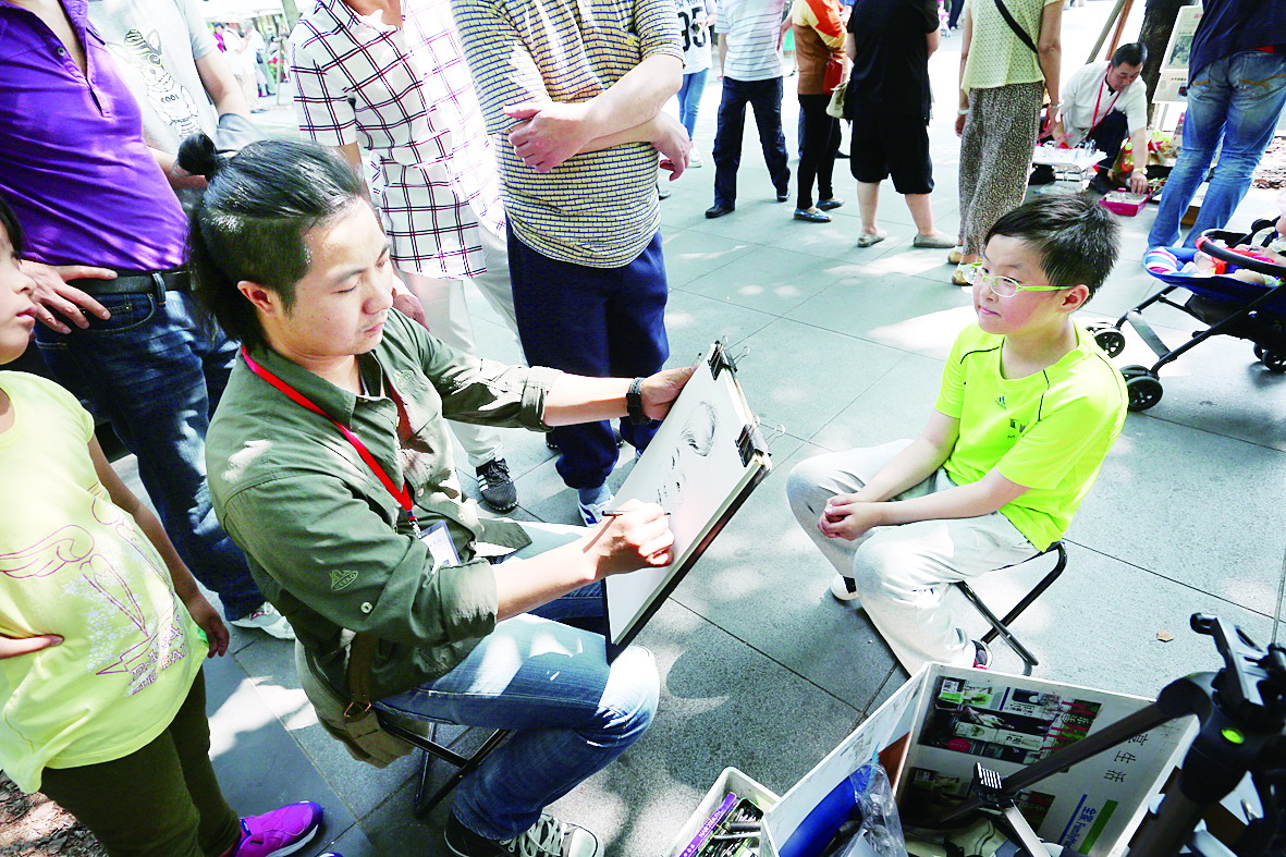 街头艺人的试点表演区域也由原先静安公园一个点,新增了“静安800秀”和南京西路“上海商城”临街区域两个表演点。这些街头艺人将根据“排片表”,分别在工作日或周末下午,每天进行3小时的表演。图为街头画像艺人苏楠在静安公园为路人画像。 本报记者 余儒文 摄