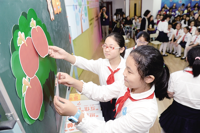(记者 顾武 文/肖鸣亮 摄)10月11日下午,市学生心理健康教育发展中心、区教育局、上海教育出版社联合在闸北第一中心小学举行“小学女生教育课程展示暨《花样女孩》新书发布”活动,向全市推广这一全国首本小学女生性别教材读本,并向各区小学德育教研员代表赠送该书。