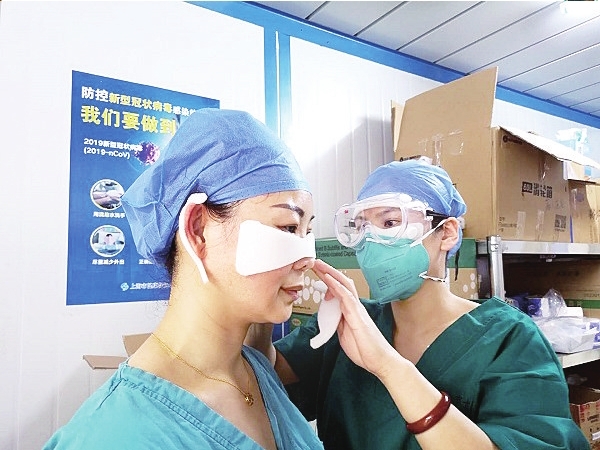 在研发人员的帮助下,她们先后在脸颊、额头和耳后贴上鼻贴、额贴和耳贴,然后再套上口罩和护目镜。高美丽告诉记者,这个小发明一贴到脸上,就感觉舒服了很多,“材料很软、很舒服,感觉口罩和护目镜对皮肤的紧绷感和压迫感都没有了。”高美丽开心地说道。
