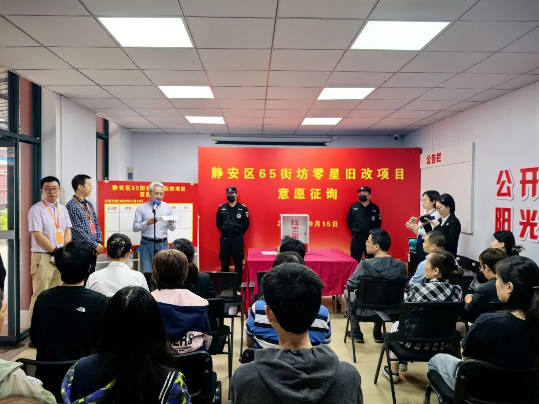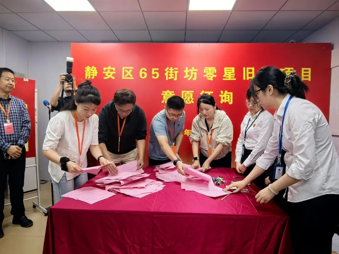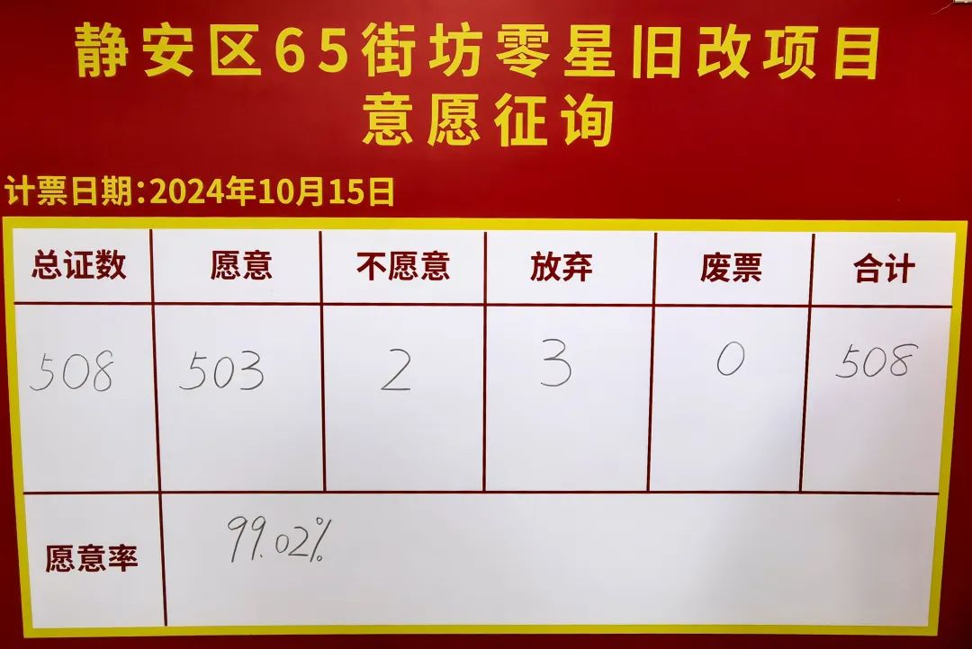 当天上午,静安区65街坊零星旧改项目意愿征询活动顺利举行,街道负责人现场宣布:“静安区65街坊零星旧改项目意愿征询以99.02%的愿意率高比例通过!”