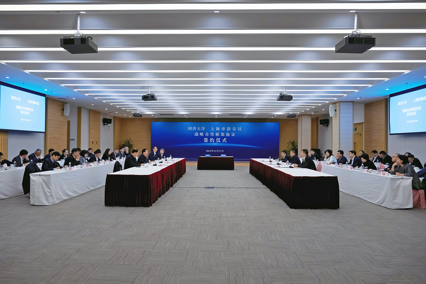 12月17日,静安区人民政府与同济大学战略合作协议签约仪式在静安区人民政府四楼多功能厅举行。双方深化战略合作,实现“区校联动、优势互补、资源共享、共赢发展”,推动“国际静安、卓越城区”建设和同济大学中国特色世界一流大学建设,共同打造中国式现代化的城区样板。同济大学党委书记、中国工程院院士郑庆华,校长、中国科学院院士杨金龙,党委常委、副校长石振明,党委副书记刘润;静安区委书记钟晓咏,区委副书记、区长翟磊,区委常委、副区长梅广清出席仪式。