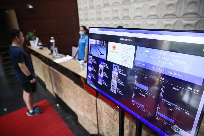 7月1日下午,桃浦全民健身中心。准备游泳锻炼的居民章大伯,在入场时拿出手机出示绿色“随申码”,身后的屠女士则直接“刷脸”验证,游泳场所工作人员通过授权的管理员身份在“上海游泳健身”后台查验,仅仅几秒钟就完成扫码、刷脸入场,十分便捷。