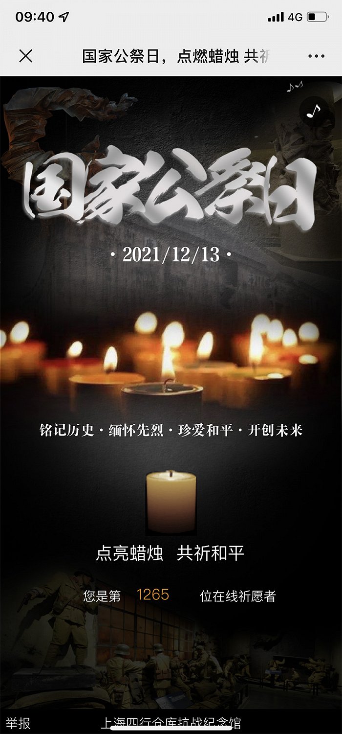 2021年12月13日是第8个国际公祭日。为缅怀抗战英烈,悼念死难同胞,今年上海四行仓库抗战纪念馆特别上线 “在线祈愿”小程序,开展线上“铭记历史、共祈和平”悼念活动,市民可以通过点亮蜡烛,寄托哀思。