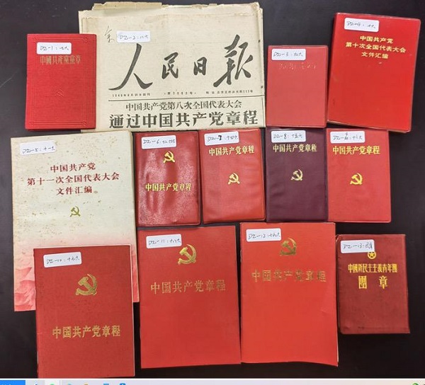 其余展示的党章和资料来自退休教师余兴发教授。喻馆长介绍,在二十大召开前夕,学校档案馆收到了一批特殊的捐赠,近90岁高龄的余兴发教授委托他的学生刘志远教授,将收藏的七大以来历次党章和相关资料捐赠给学校档案馆。余教授说,自己有幸见证了中华人民共和国的成立,梦想成为中国共产党党员,为此不断奋斗,积极争取入党,还自己购买了中共七大党章作为学习材料。1956年,在中共八大召开前,22岁的他终于获批入党,从此学习党章、收藏党章成为他学习生活的一部分,这些党章也成为他成长的见证。得知“党章学习流动教室”的展出,余教授很高兴这些党章和资料能借此发挥更大的价值。