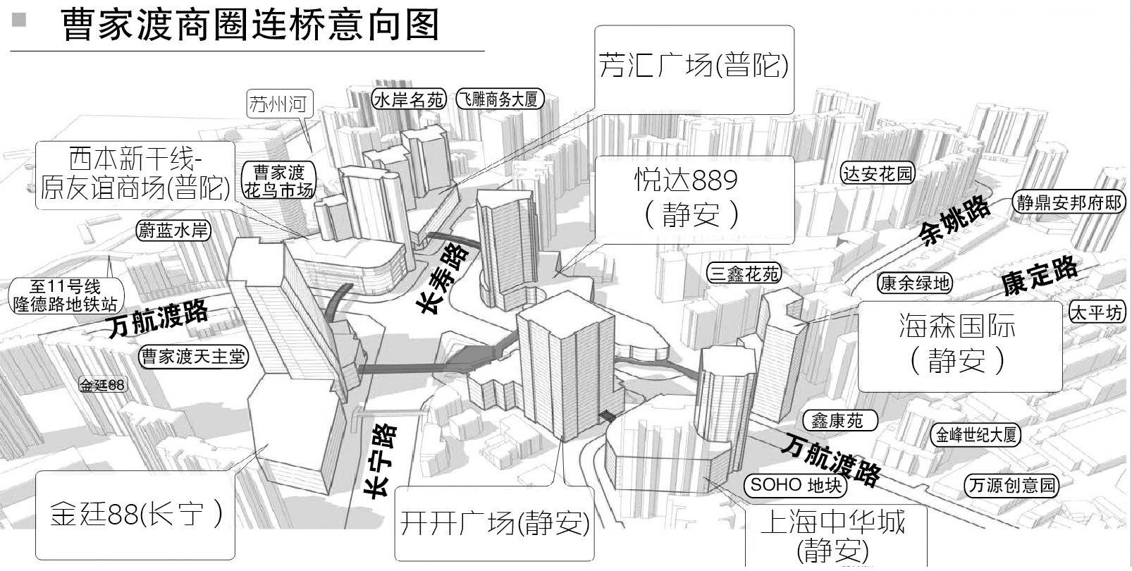 根据规划,今后曹家渡商圈将建设天桥,连通局部地下空间,串联起多个商业建筑,通过人行天桥延长购物流线,提升空间通达性,并使城市景观更富层次感。连廊路线以悦达889广场为中心,串联了芳汇广场、曹家渡花鸟市场、西本项目、金廷88、晶采广场、开开广场、中华城、海森国际等九大区域地标,连廊外延还直通轨交11号线隆德路站,大大提升交通畅达度。