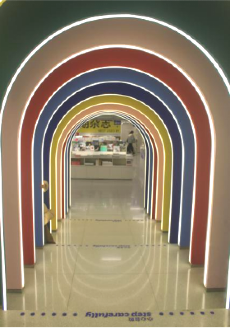 作为小而精的社区商业,M+马利四周有浓厚的居住生活氛围,其扎根于社区,与社区融合,其以复合型的多元形态,汇聚了咖啡,甜品,日料,书吧,手工坊,艺术展示等受当下年轻人热捧的碎片连接,亦成为集潮流,艺术,趣味等新型生活调性的创意名片。 随着动线前进,充满生命力和活力的色彩元素与绿意不断涌现,轻快的色彩表达也唤醒了老上海人的童年回忆。