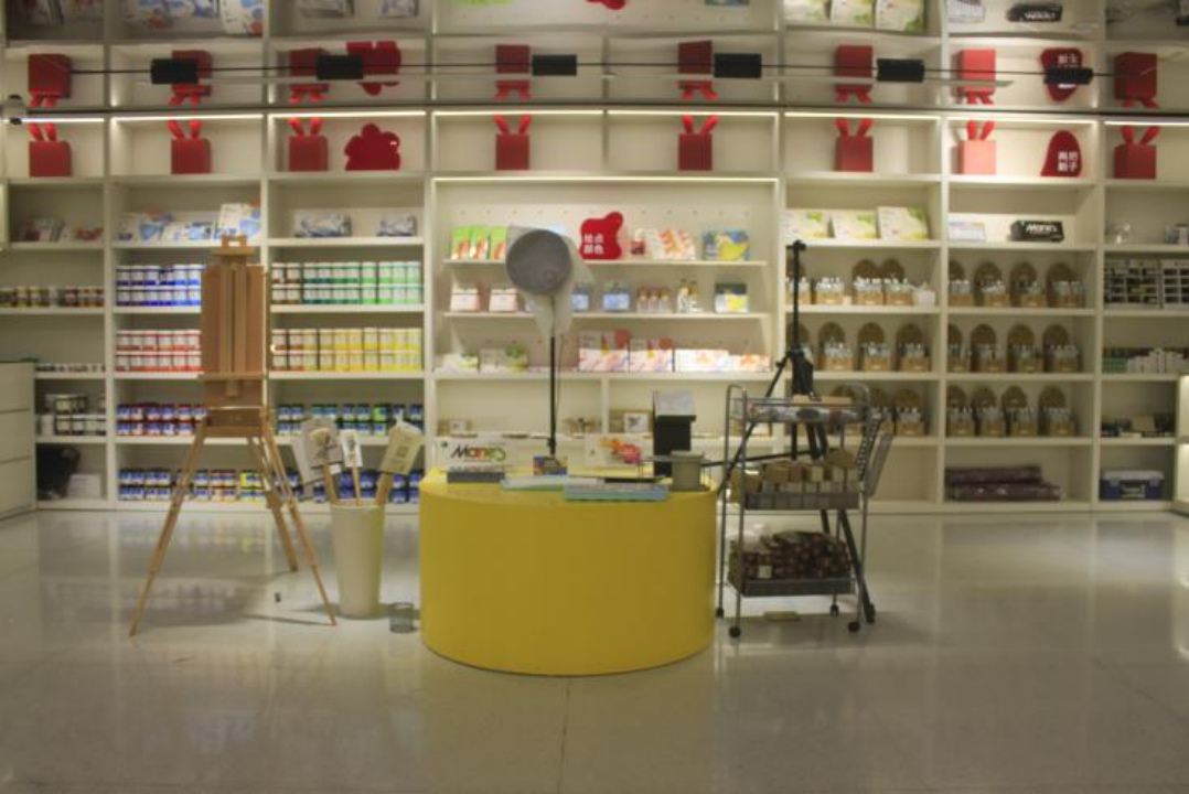进入其中,左手边是许多潜望镜的集束,错落有致,其颜色碰撞,极抓人眼球;右手边展陈了马利品牌的各种产品,包括颜料,画笔,调色盘等,让人从中读出马利品牌的百年发展。