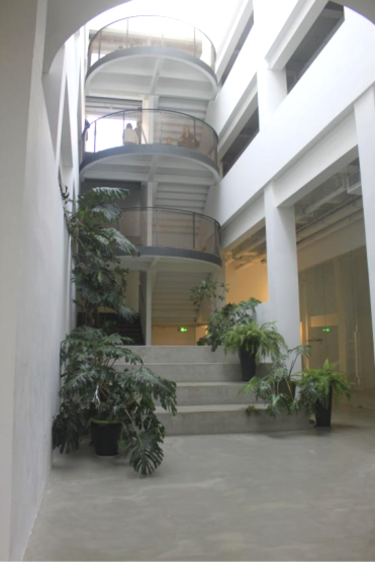 中庭顶部采用全景天窗,让阳光洒落其中,增加了空间的通透性。楼梯增添了场景的层次;摆放的绿植打破色彩的单调,让空间充满生机。空间美感与功能性兼具,拾级而上,就能进入二层的店铺。经过艺术的重塑,老建筑华丽转身,既保留了历史积淀,又融入了当代时尚艺术审美元素,蜕变成了符合现代审美并兼顾多元功能性的新空间。