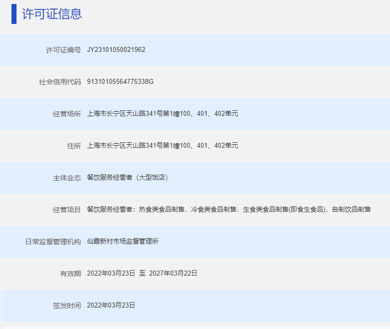 上海宝佳餐饮管理有限公司食品经营许可证信息 来源:上海市市场监管局网站