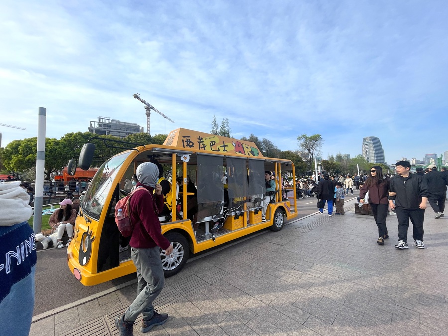 节假日在徐汇滨江公共开放空间亲水平台行驶的“西岸巴士”,接驳来往市民。 舒抒 摄