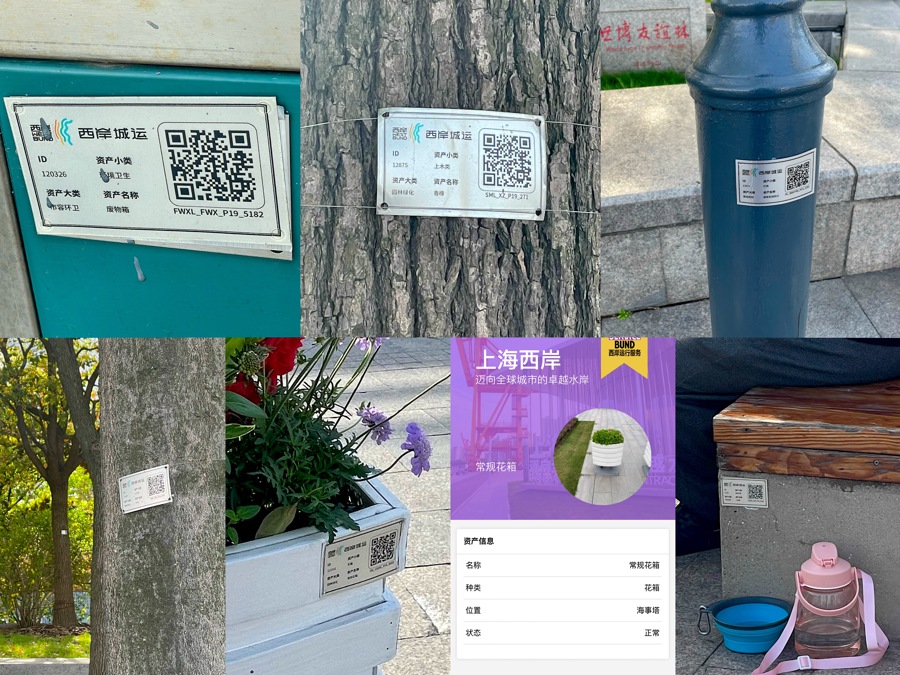 眼下,当人们漫步徐汇滨江,仔细看会发现所有的树木、花箱、垃圾箱、座椅等公共设施都贴了一张标有“西岸城运”的二维码,游客扫码后跳转至植物科普等内容,而管理人员用APP扫码则会生成工作界面,用于上报设施损坏或是问题发生的具体点位。