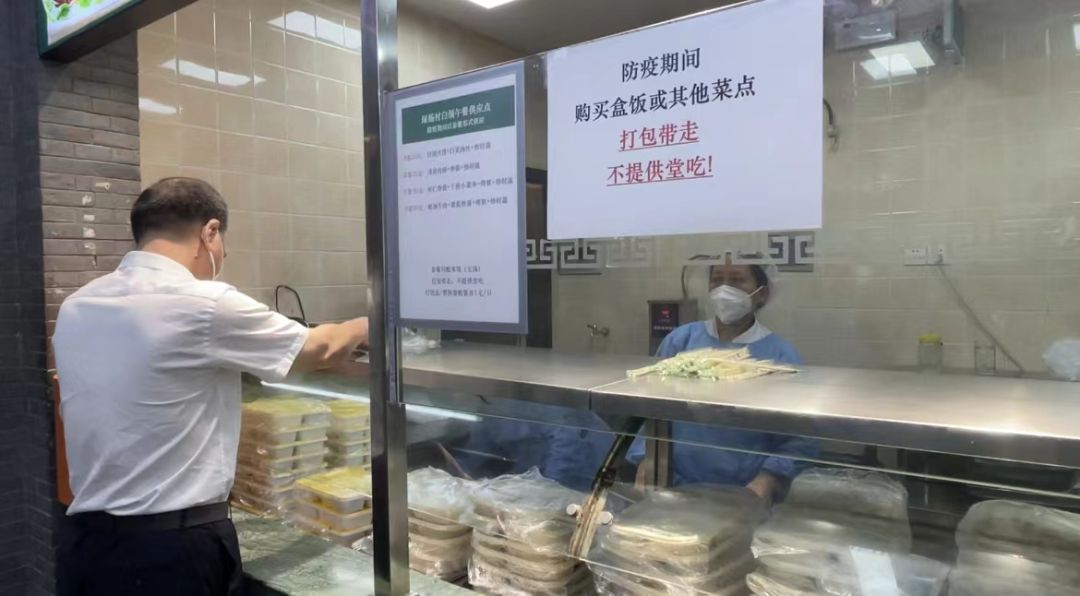 除了企业订餐,也有白领到餐厅点餐打包。白领张先生说,一周七天菜品不重样,每天都有8大荤、5小荤、3素供选择:“买了点牛肉,黄瓜炒肉,还有水果。疫情前这边金汤肥牛、黑鱼等等,也很经典的,我们还在问,说以后再弄一点。”