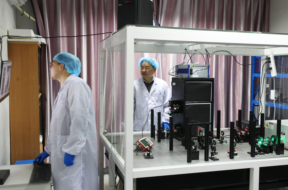 阮昊研究员(右)和赵苗博士(左)在上海光机所光学实验室,利用国际首创的双光束调控聚集诱导发光超分辨光存储技术做写入试验。2月21日,中国科学院上海光学精密机械研究所对外宣布存储容量是普通光盘上万倍、普通硬盘上百倍的“超级光盘”诞生。新华社记者 方喆 摄