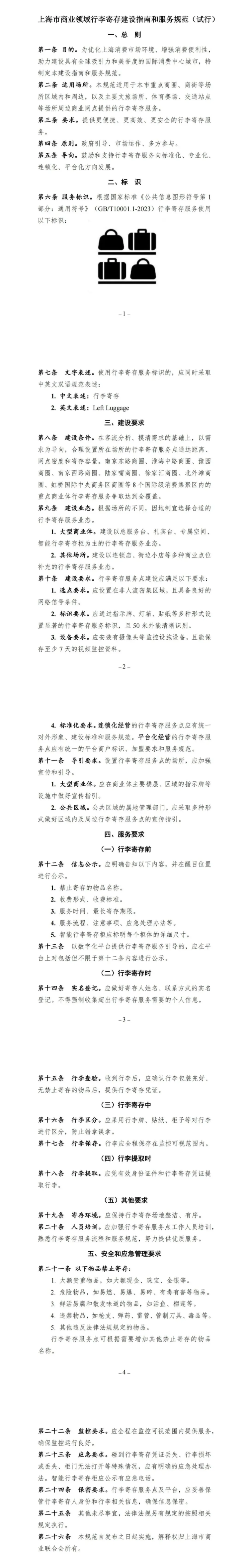 《上海市商业领域行李寄存建设指南和服务规范(试行)》明确,力争实现南京东路商圈、淮海中路商圈、豫园商圈、南京西路商圈、陆家嘴商圈、徐家汇商圈、北外滩商圈、虹桥国际中央商务区商圈等8个国际级消费集聚区内的重点商业体行李寄存服务全覆盖;通过指示牌、灯箱、贴纸等多种形式设置显著的行李寄存服务标识,且50米外能清晰识别;行李寄存服务标识采取中英文双语表述,方便中外游客使用。具体政策内容详见↓
