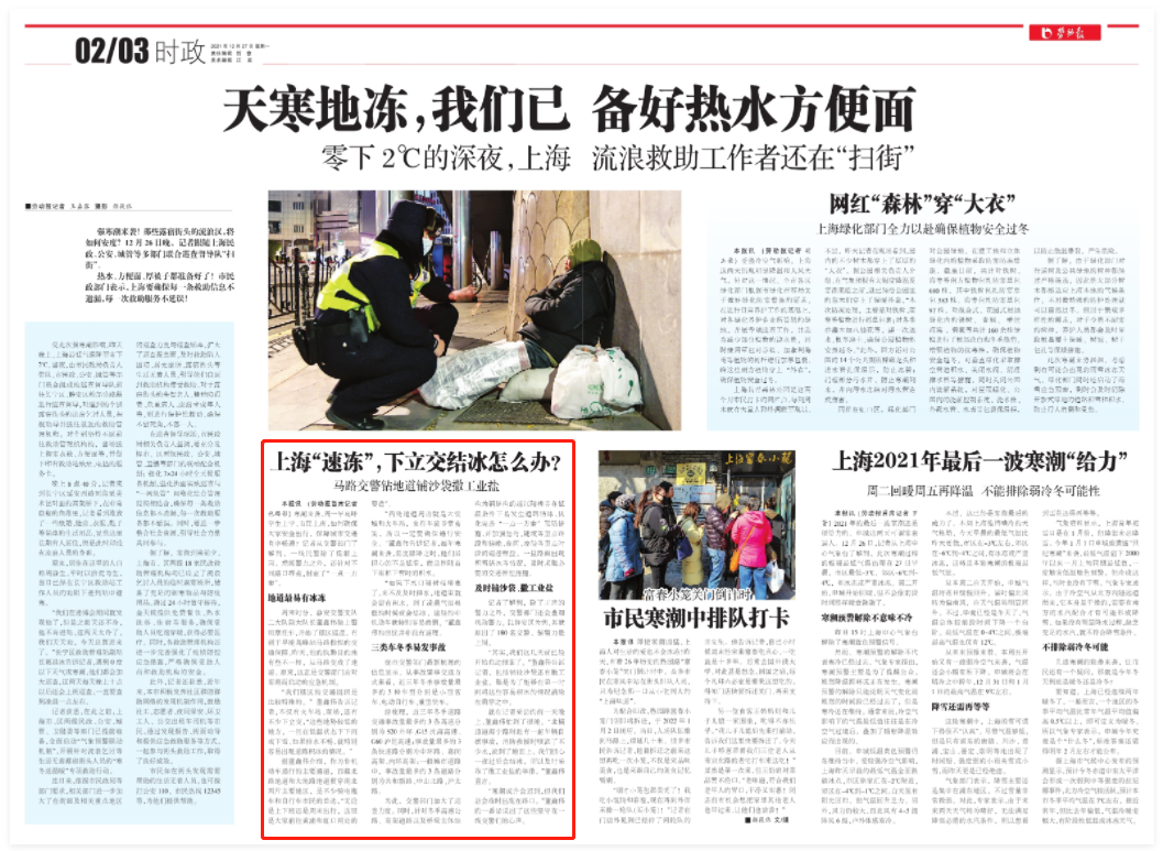 就在记者采访的前一天晚上,董鑫伟忙到了很晚。“北横通道海宁路附近有一起车辆自燃事故,消防救援时喷洒了不少水,流到了地面上。我们担心一夜过后会结冰,所以及时采取了撒工业盐的举措。”董鑫伟直言。