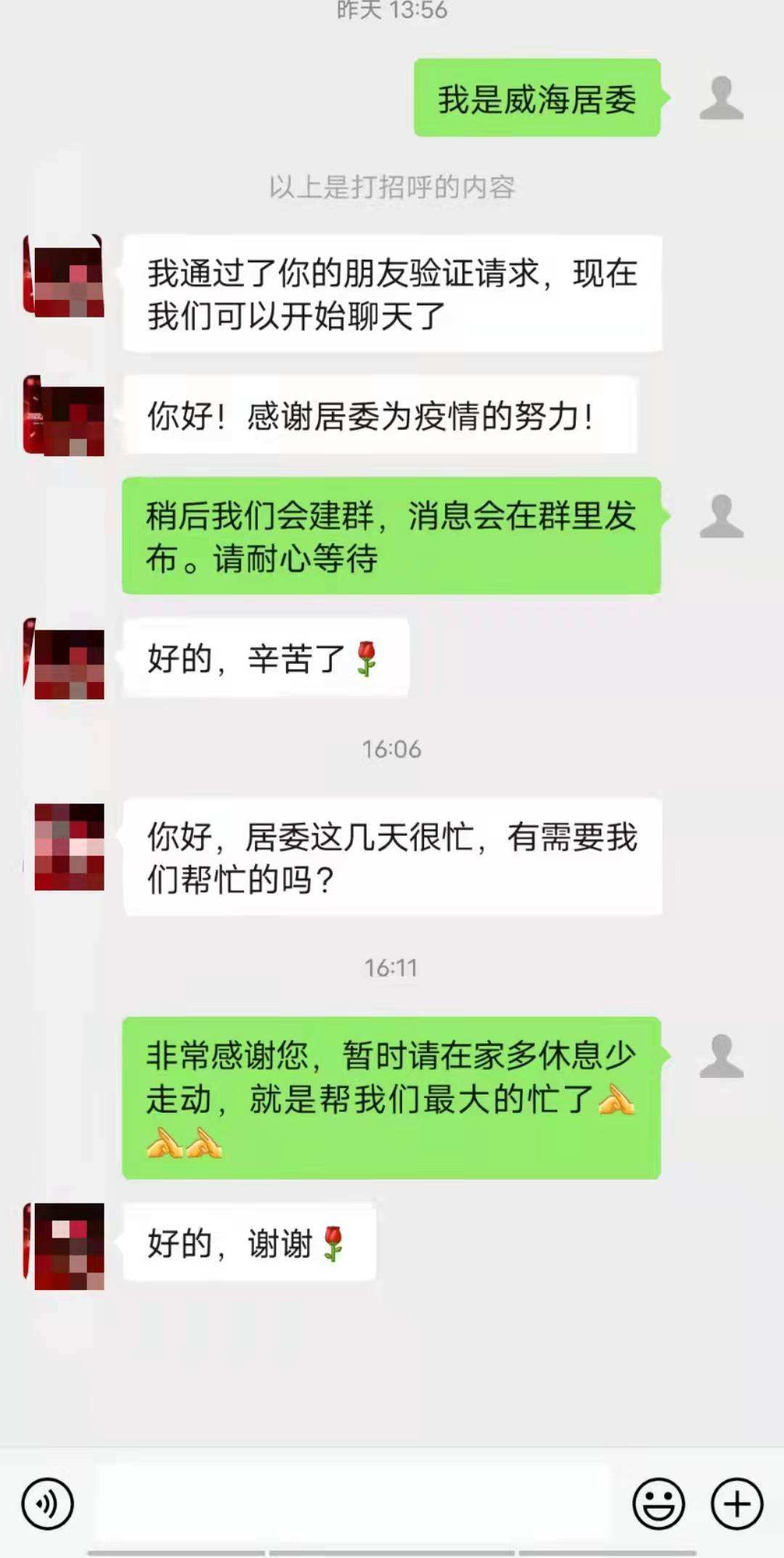 “你好,居委这几天很忙,有什么需要我们帮忙的吗?”