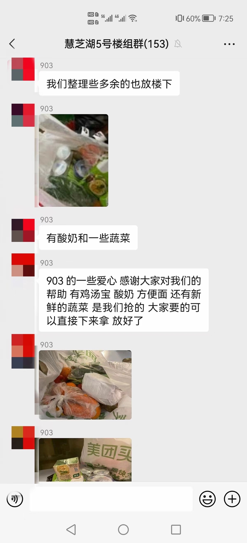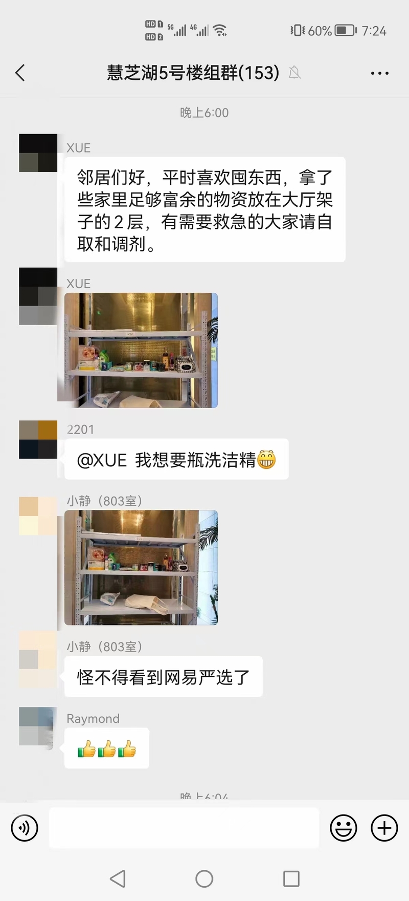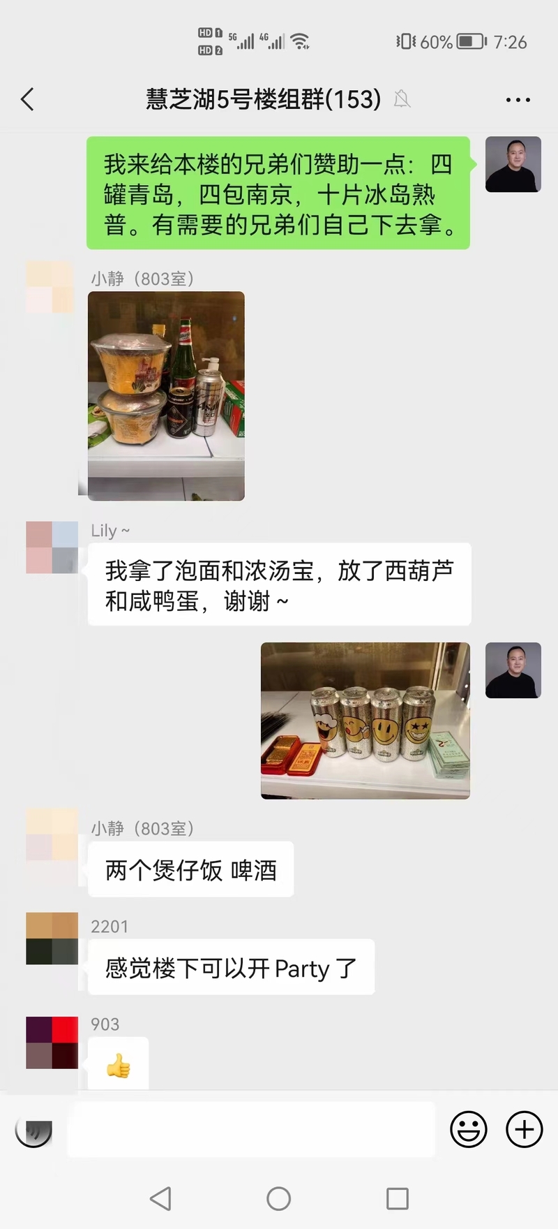 很快,2201认领了洗洁精,把自家富余的盐补充到了货架上;901认领了黄酒,整理了蔬菜、酸奶和方便面补上;2502认领了午餐肉,放下了一瓶生榨椰汁;801认领了901的一些蔬菜,补上了泡面和自嗨锅;另一位邻居拿了801的泡面和浓汤宝,补充了西葫芦和咸鸭蛋……一边认领、一边随手补货,大家心照不宣地在楼群里延续着这场爱心接力,感谢声此起彼伏,洋溢着满满的暖意。