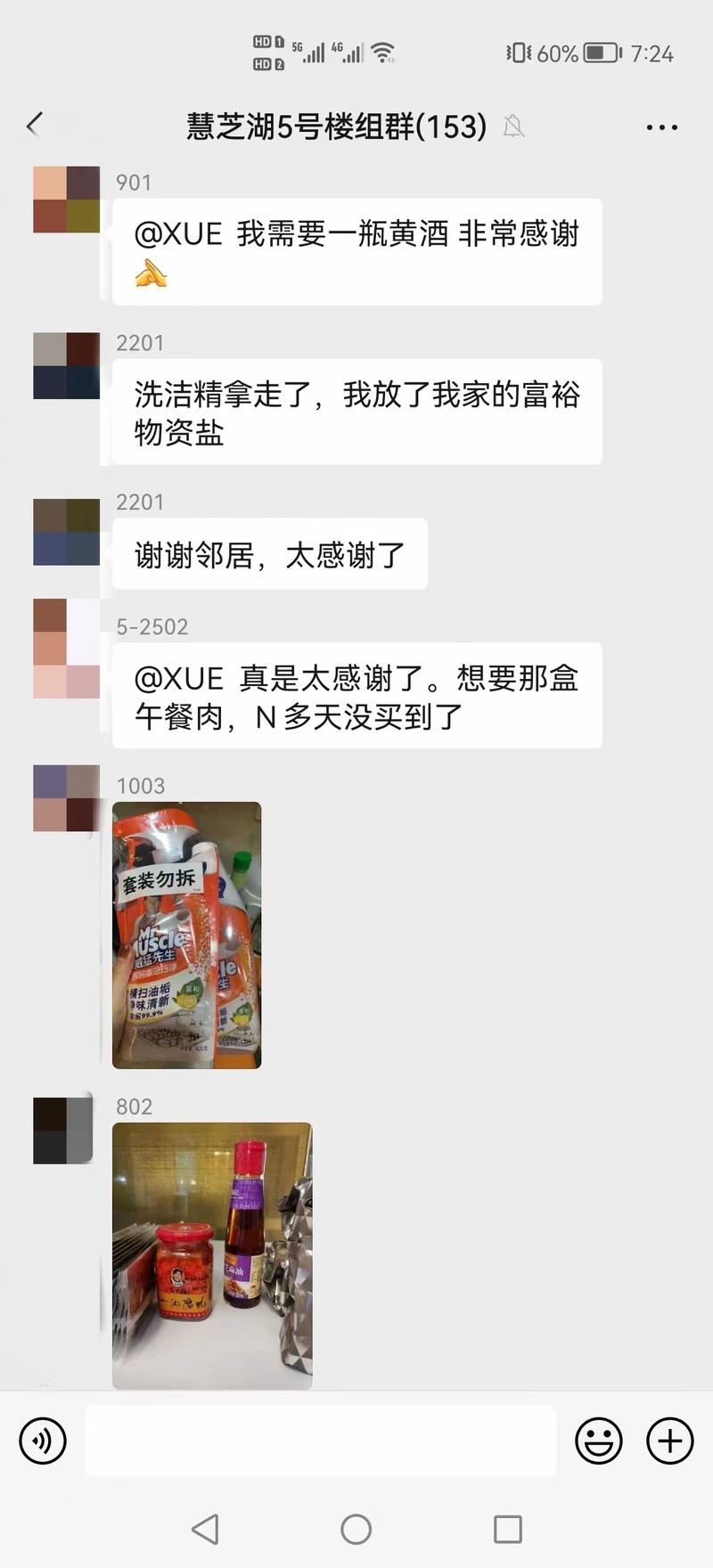 我居住的5号楼内有近百户居民,原本大家互相之间都不太认识。封控期间,楼里居民主要通过微信群交流,相当活跃。小区封了大约一周后,我们发现大米、鸡蛋这些都不缺,但调料却不太容易买到。如期解封无法实现,开始不断有人在楼里“求援”。我有白糖你有盐、他有酱油我有醋,靠着邻居之间互相调剂,零碎的需求基本还能对接上。