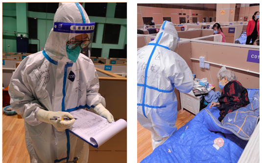当我在方舱里看见她的时候,她正抚着腰一瘸一拐地走着。我问她怎么了,她说是老毛病,可能这两天累了,腰椎病犯了,我让她出舱休息,她却答:“我可以坚持,大家都很辛苦,人手也不足,如果我休息了,别人就得多做”。