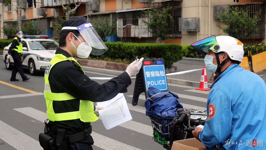 4月25日上午,民警陆念秋在中华新路上对过往通行车辆及人员进行临检,对于符合外出条件的骑手他会说声:“做好防护,路上注意安全!”
