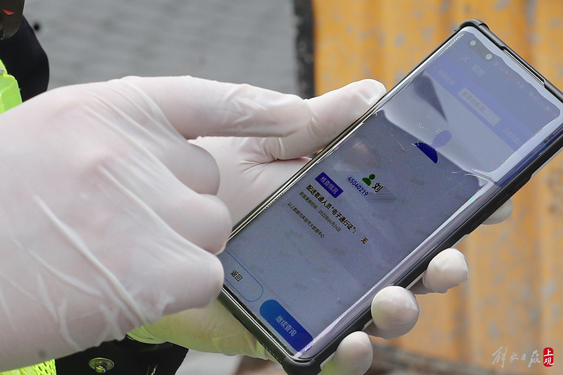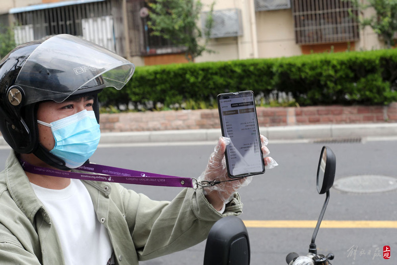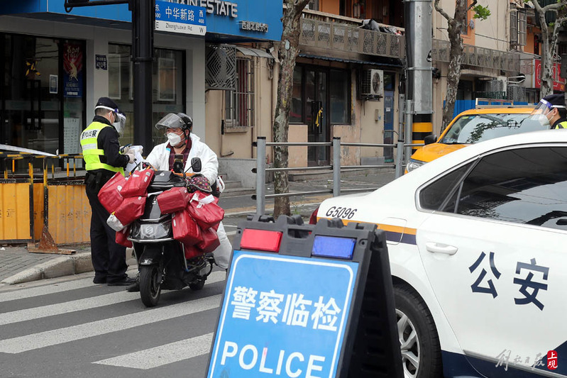 芷江西路派出所民警陆念秋在查验骑手的核酸检测阴性证明及通行证,他说,“我们可不希望骑手倒下,大家还等着他们配送物资!”