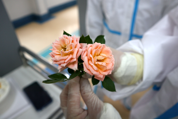 图说:医护人员在医院门口摘了两朵鲜花送给老人。刘兆杰 摄