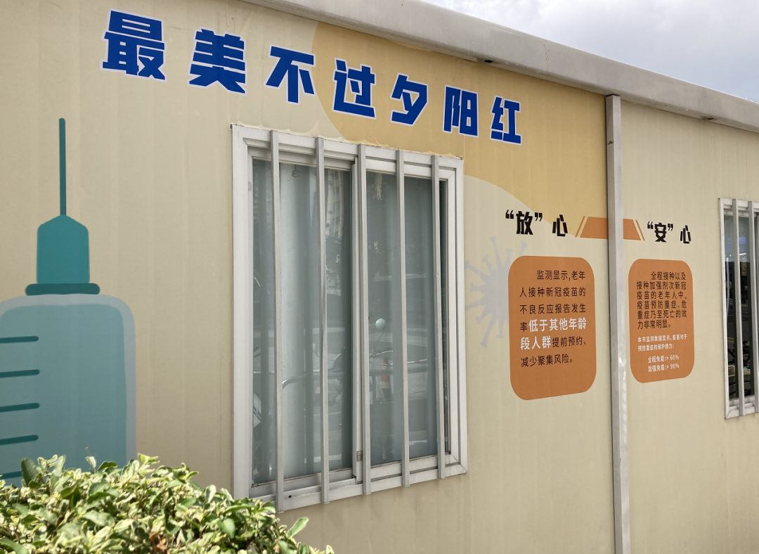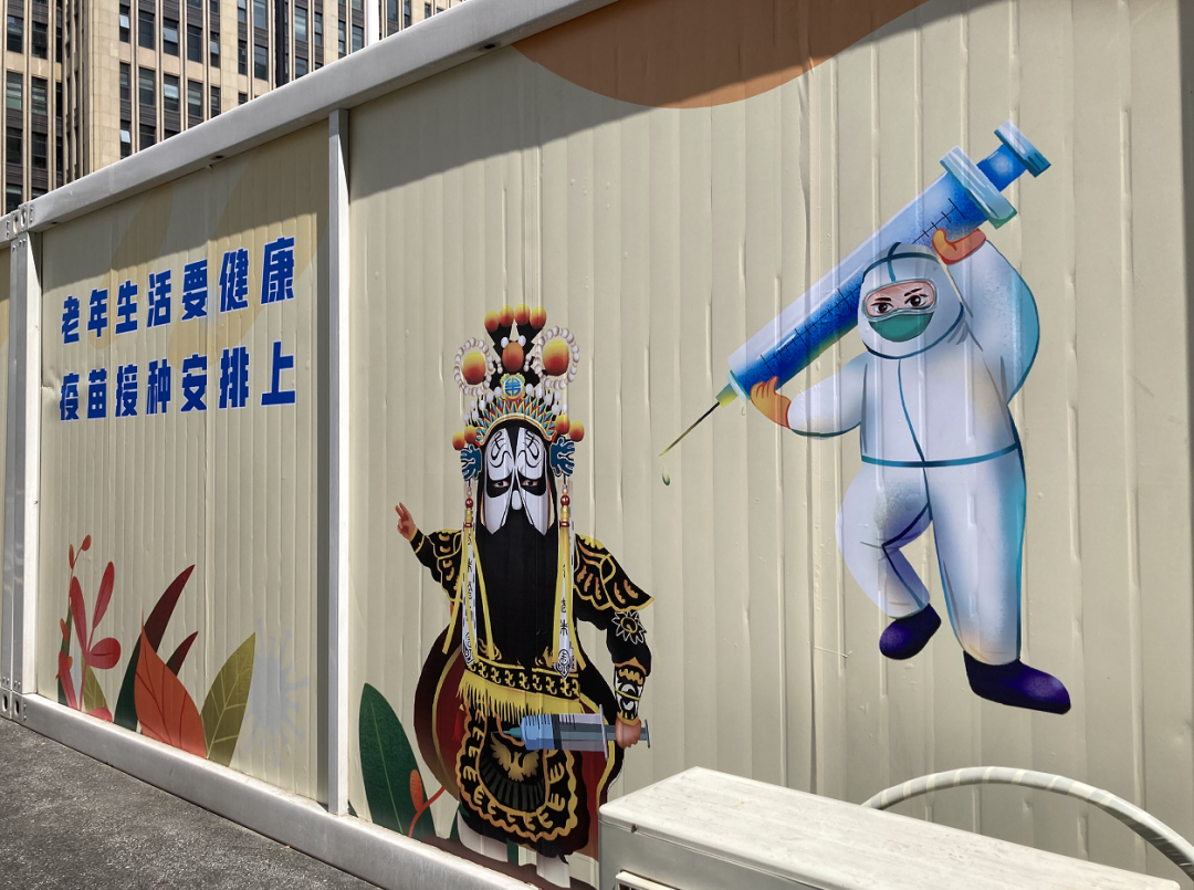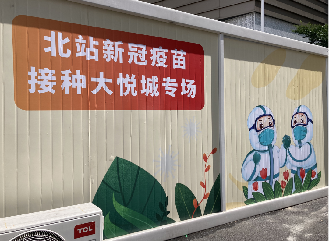 北站街道工作人员金老师告诉记者,这个点位设计之初本是用来服务附近老年人,营业时段为上午9:30至下午16:00。“这些京剧元素、宣传标语是希望能够吸引过往老年人的视线,提高老年人疫苗接种比例,为他们提供更好的保护。”她补充道,“后来我们关注到附近上班族、来往的游客也有注射疫苗的需求,便及时作出调整,目前这个点位为18岁以上市民提供接种服务。”