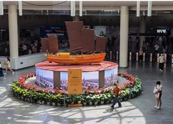 图说:在人民广场地铁站展示的上海五桅沙船