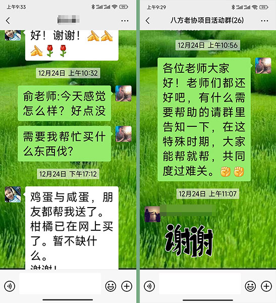邻里之间暖心的举动不仅仅限于送药、关心需求本身,还有第一时间的“陪伴”互助。“昨天下午,小区一名八十七岁的居民因连日发烧不退,家人非常着急,想尽快把老人送到医院检查,而这时候120排队前面还有100多个号,我们楼组志愿者还有楼组群的家庭医生,赶紧联系居民了解具体情况。”周静告诉记者,老人当时在家用血氧仪做了检查,在判断老人的情况后,家庭医生与家属保持实时联系,居委会、楼组志愿者关注老人的身体情况,尽量疏导家属焦急情绪,当晚老人送医检查。12月26日下午,经过电话回访,老人目前已经回到家中,近日需前往医院输液,正在治疗中。