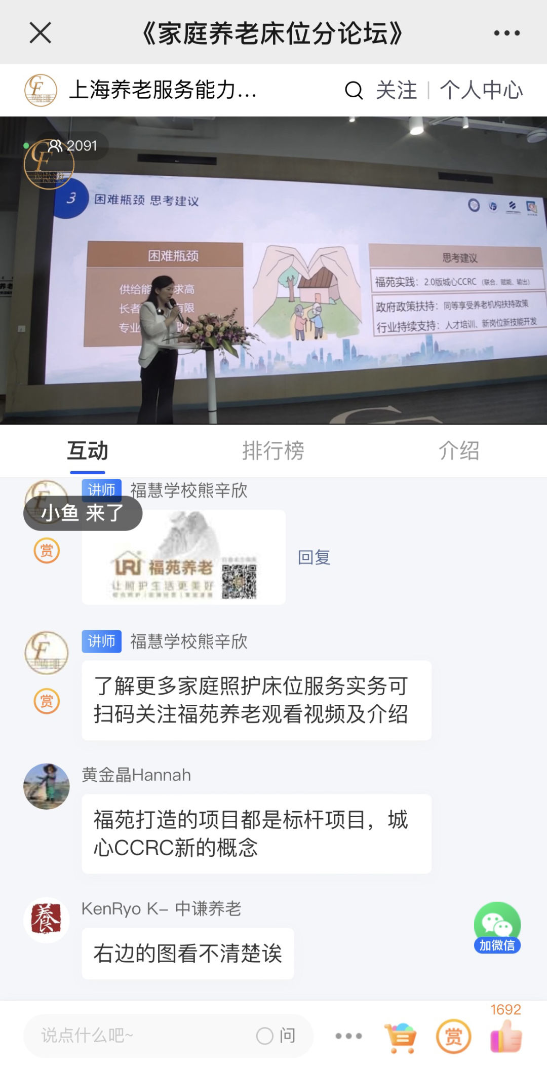 活动中,闵行区民政局局长姚媚、市养老服务行业协会会长徐启华分别为论坛致辞,市民政局二级巡视员陈跃斌为论坛作总结点评。论坛同步开启线上直播,超2500人观看,点赞数近1.8万。