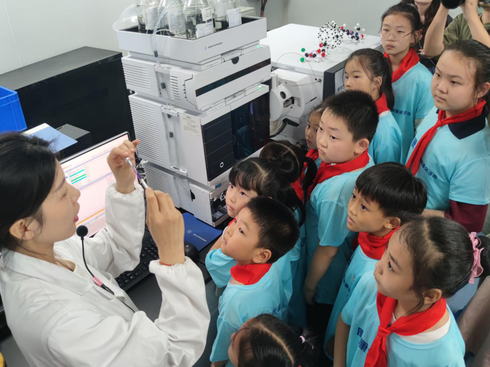 7月11日,在武汉市食品化妆品检验所,工作人员向孩子们展示食品检测过程。 (武汉市市场监督管理局供图 )