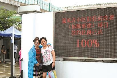 金阿姨(左)和邻居在百分百签约牌前留影。