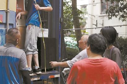 居民老叶把寓意“节节高”的竹竿放进搬场车,嘱咐家人:“让它先进门。”