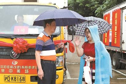 集体搬家那天,早些天搬走的金阿姨(右)特地赶回来,冒雨为自己楼里的邻居送行。